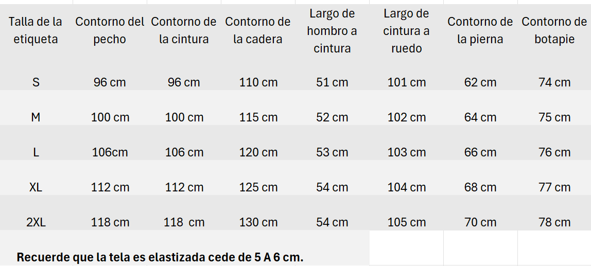 * Recorda que la tela es elastizada y se adapta a todo tipo de cuerpo.